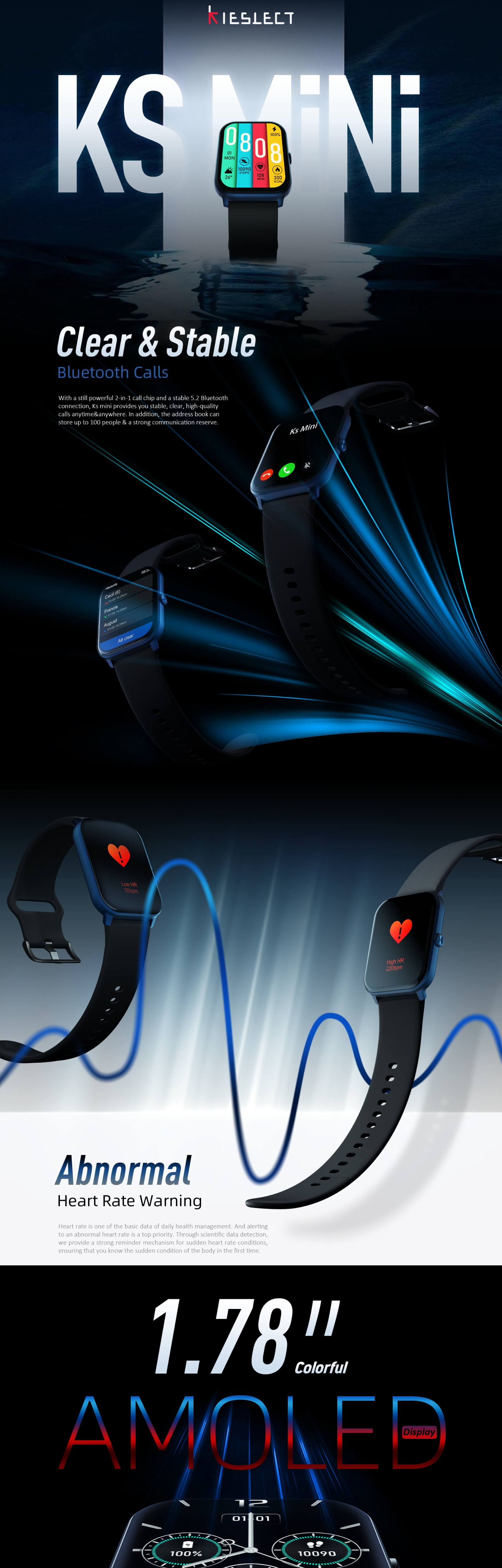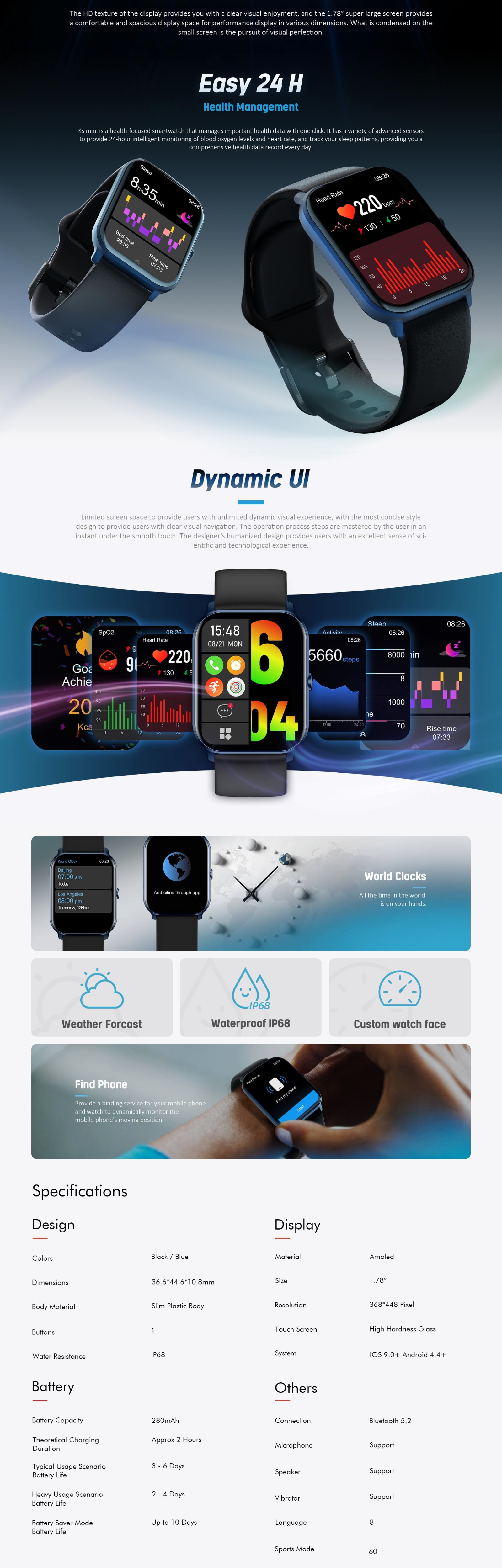Ks mini is a health-focused smartwatch that manages important health data with one click. It has a variety of advanced sensors to provide 24-hour intelligent monitoring of blood oxygen levels and heart rate, and track your sleep patterns, providing you a comprehensive health data record every day.