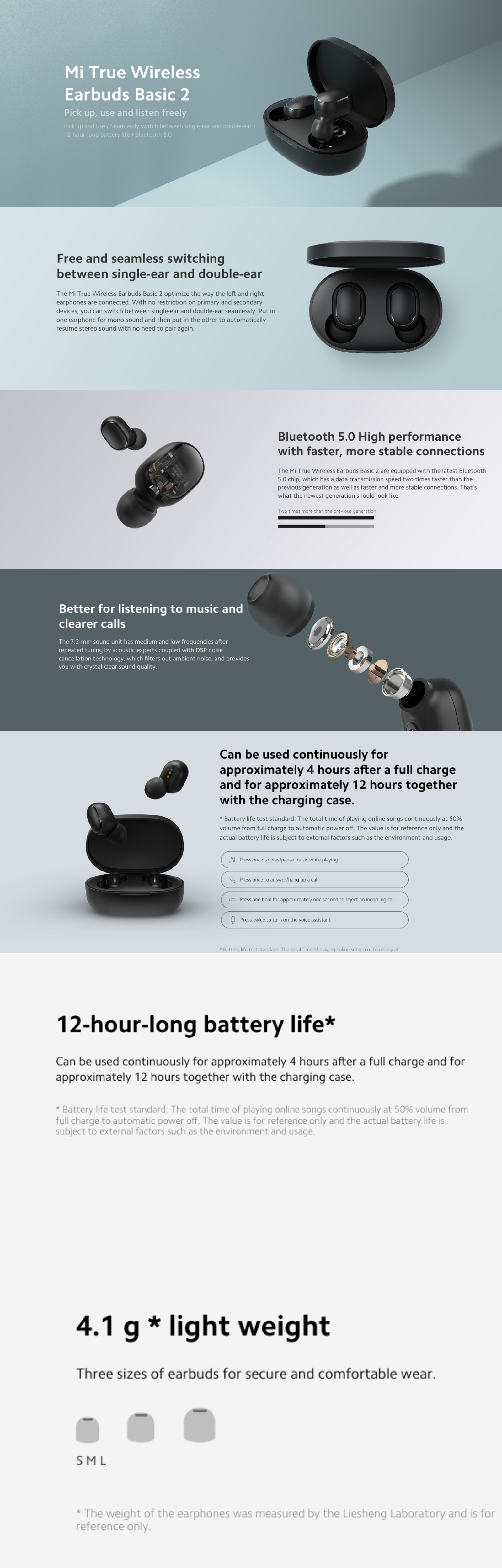 up, use and listen freelyPick up and use / Seamlessly switch between single-ear and double-ear / 12-hour-long battery life / Bluetooth 5.0